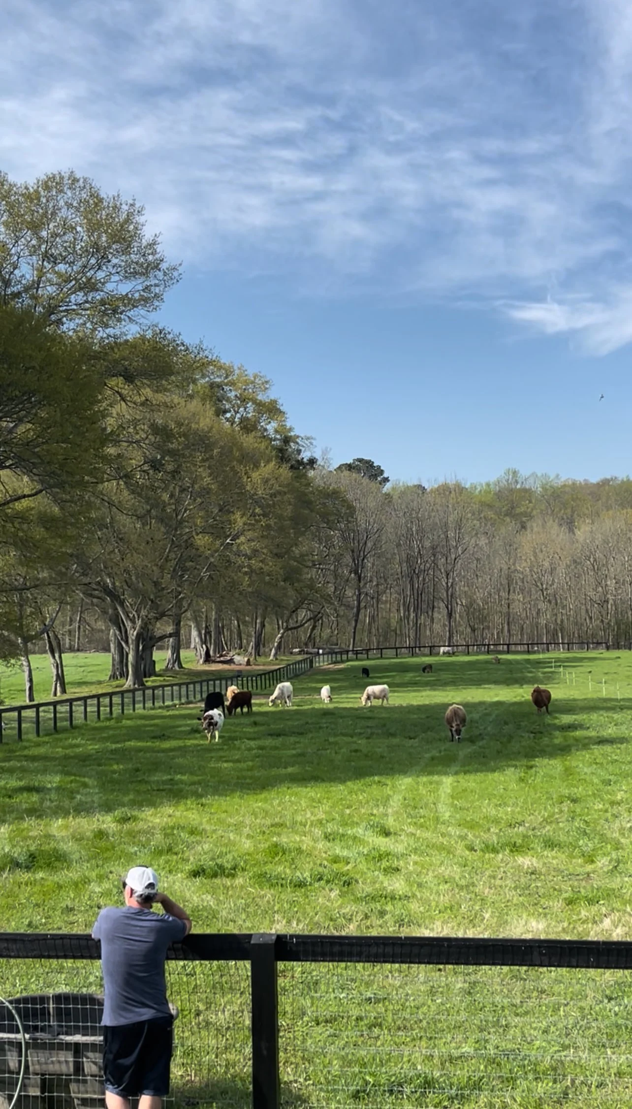 A person wearing a white cap and grey shirt stands by a black fence, watching sheep graze in a lush green field with trees and a partly cloudy sky in the background.
