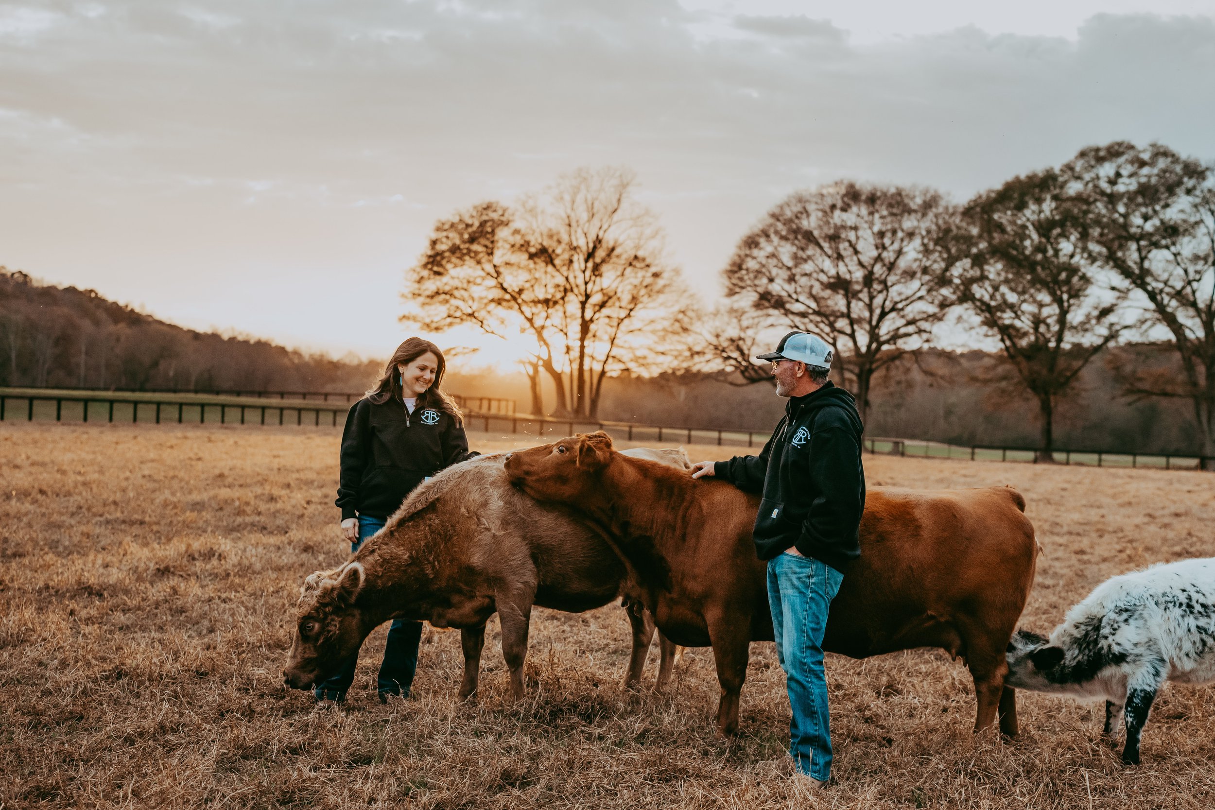 A man and woman are standing in a field with cows at sunset. The woman is petting a brown cow and smiling, while the man is touching another brown cow, both wearing dark hoodies. There are leafless trees in the background.
