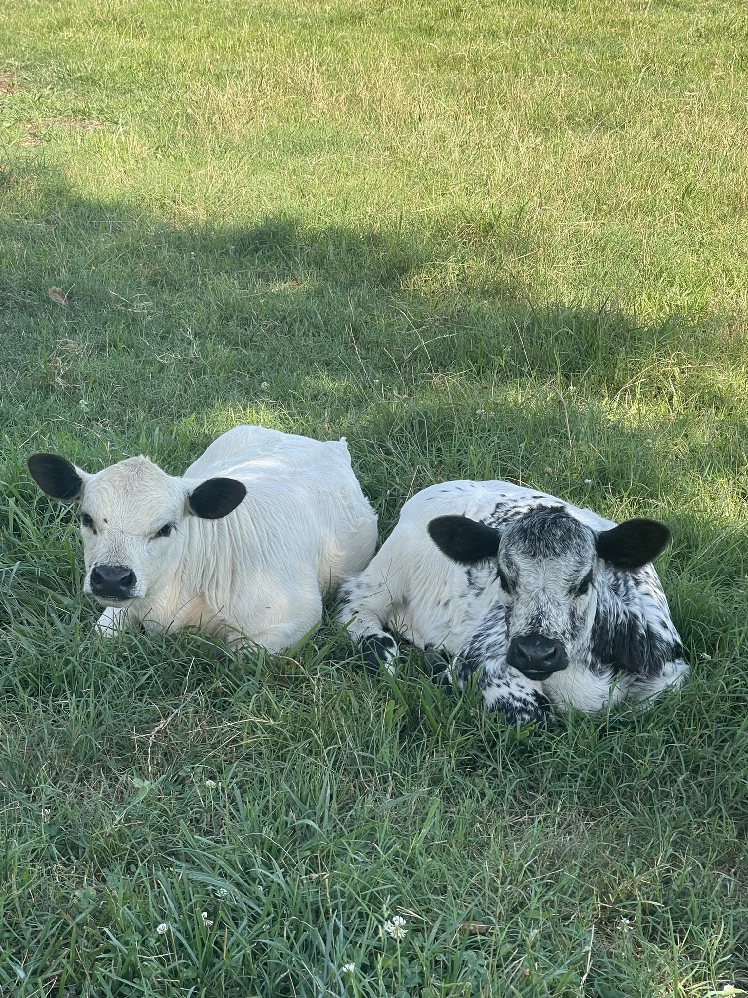 Two baby calves lying on grass in a shaded field, one white with black ears, the other white with black spots and a black face.