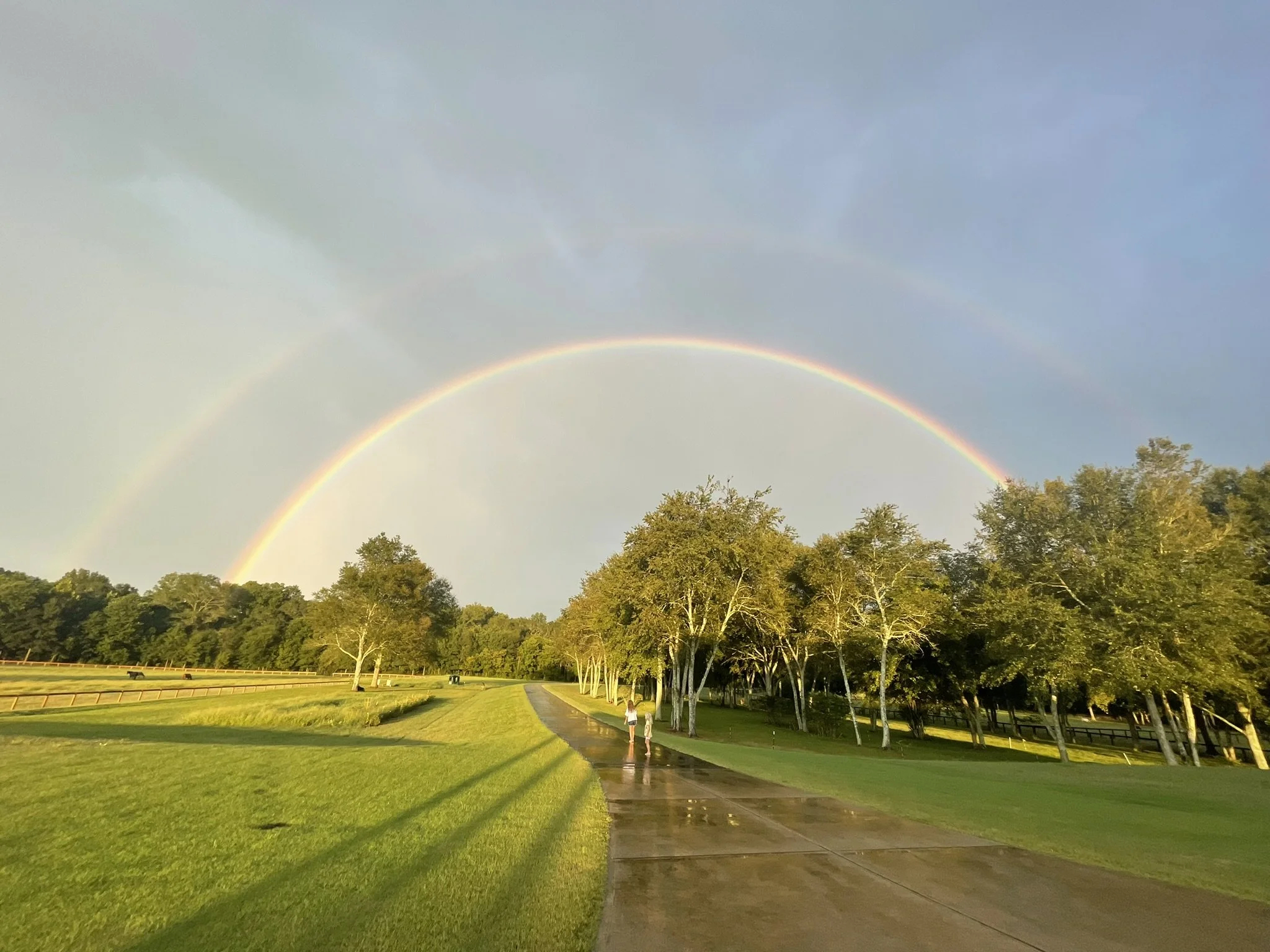 A park with a rainbow and a double rainbow in the sky, sunlight illuminating the green grass and trees, a pathway with two people walking, and puddles on the pathway reflecting the scene.